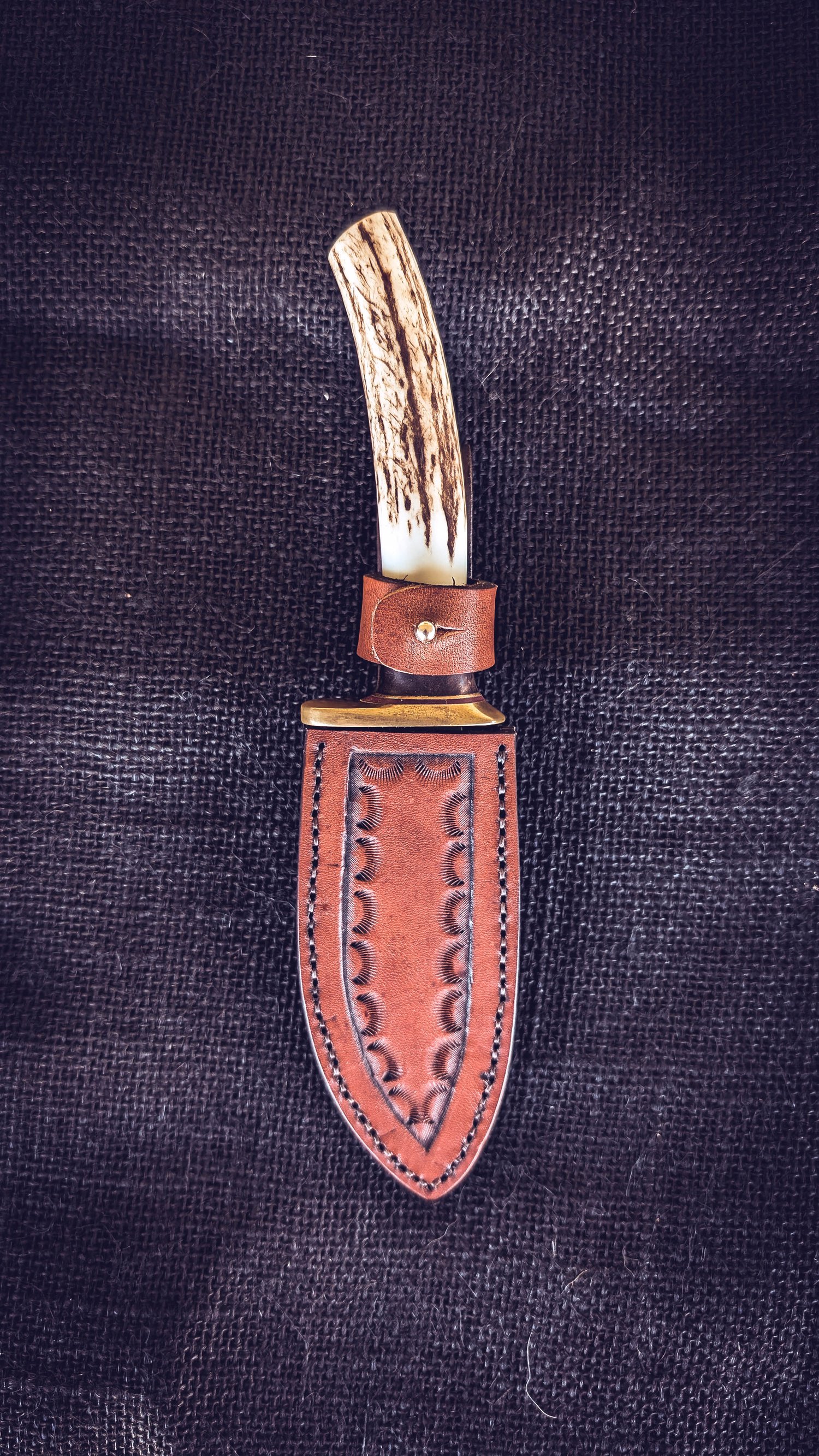 Cuchillo de desbaste de acero 80CrV2 con arenado y pavonado, guarda de latón con doble encaje y soldadura de plata, el cabo está formado por latón, fibra vulcanizada, laurel estabilizado y ciervo.