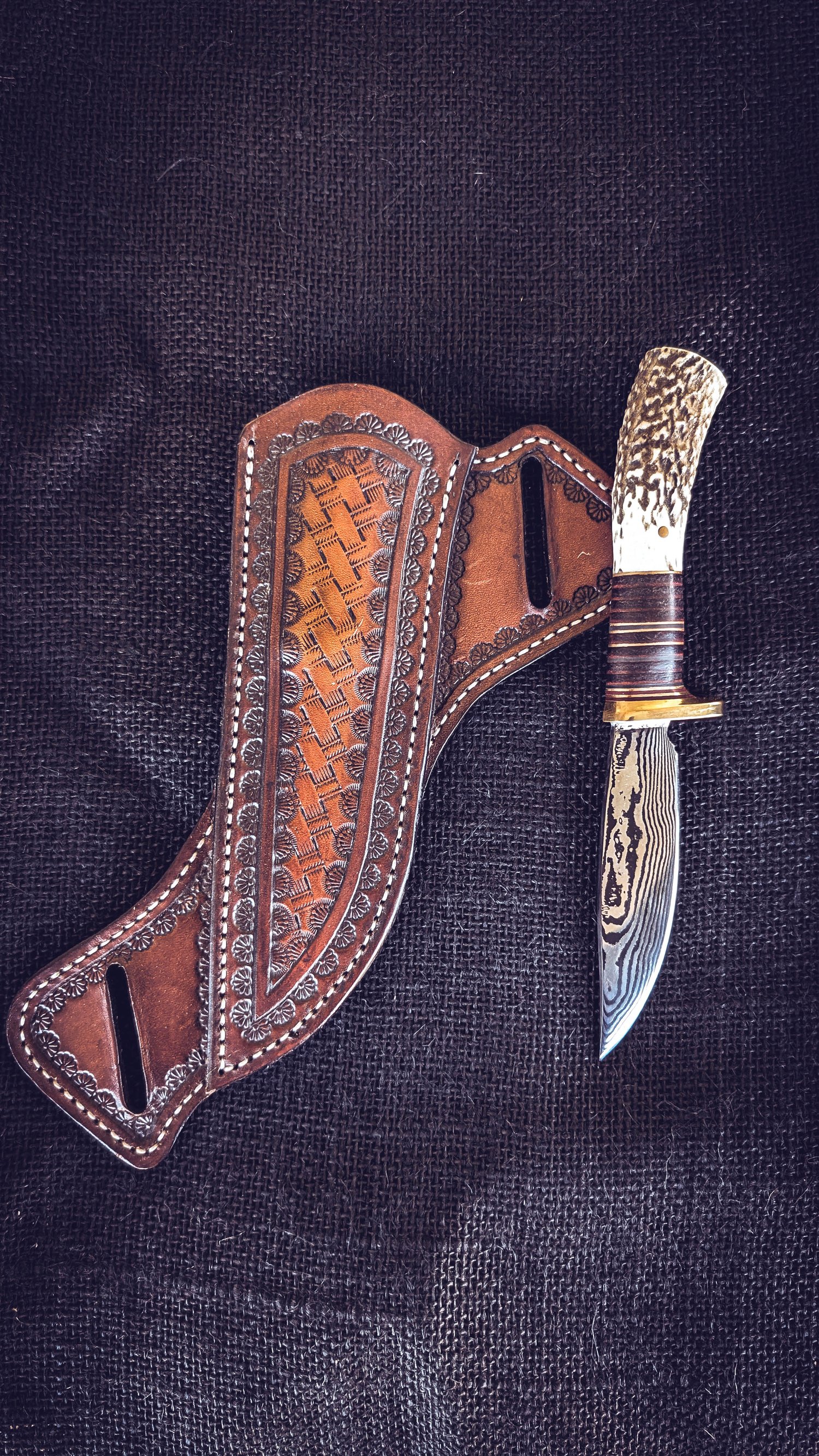 Cuchillo forjado en Damasco de 55 capas de acero 1075 y 15N20, guarda de latón con doble encaje y soldadura de plata, el cabo está formado por latón, fibra vulcanizada, cuero y asta de ciervo con tapón de vaina de bala.