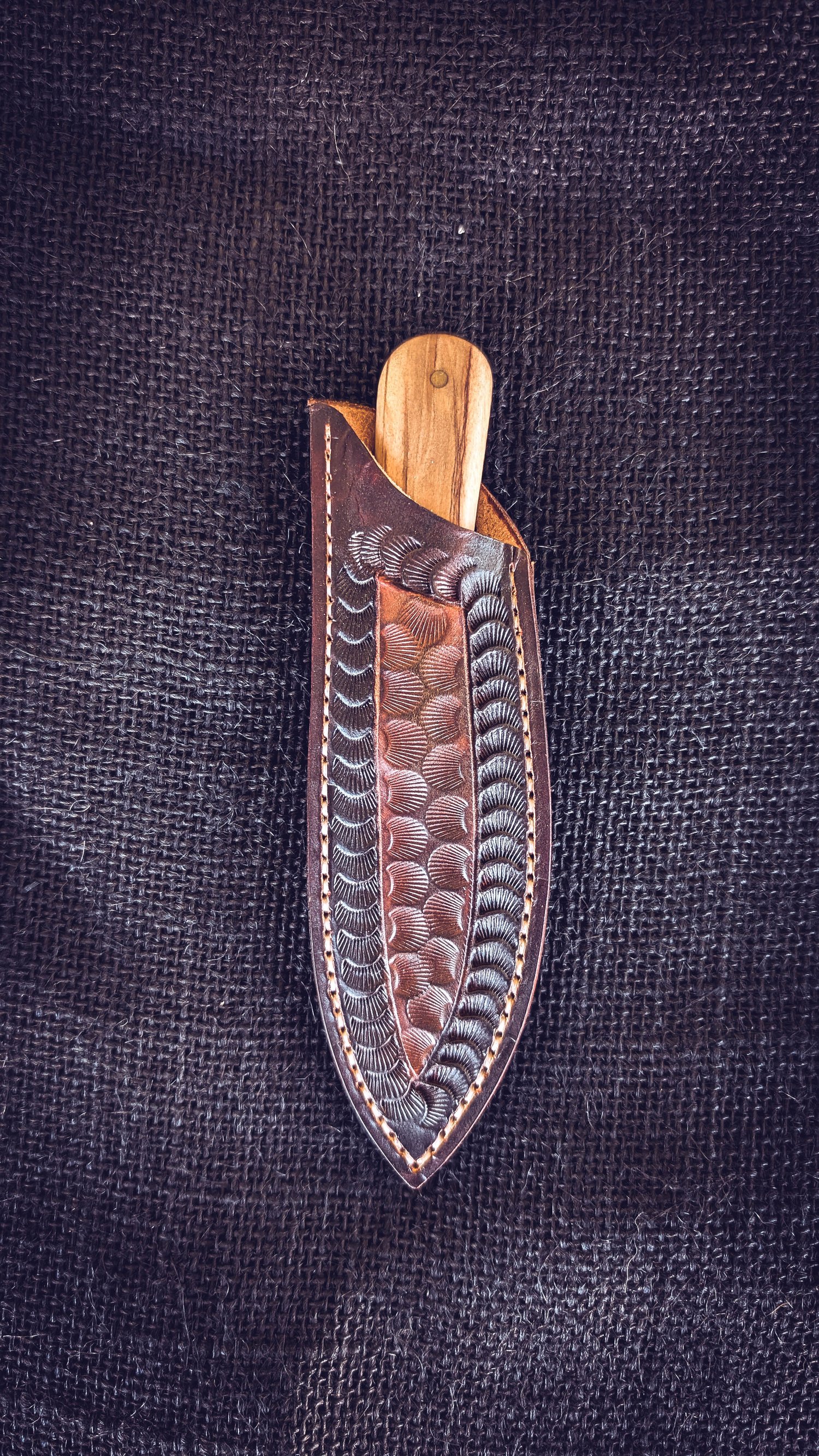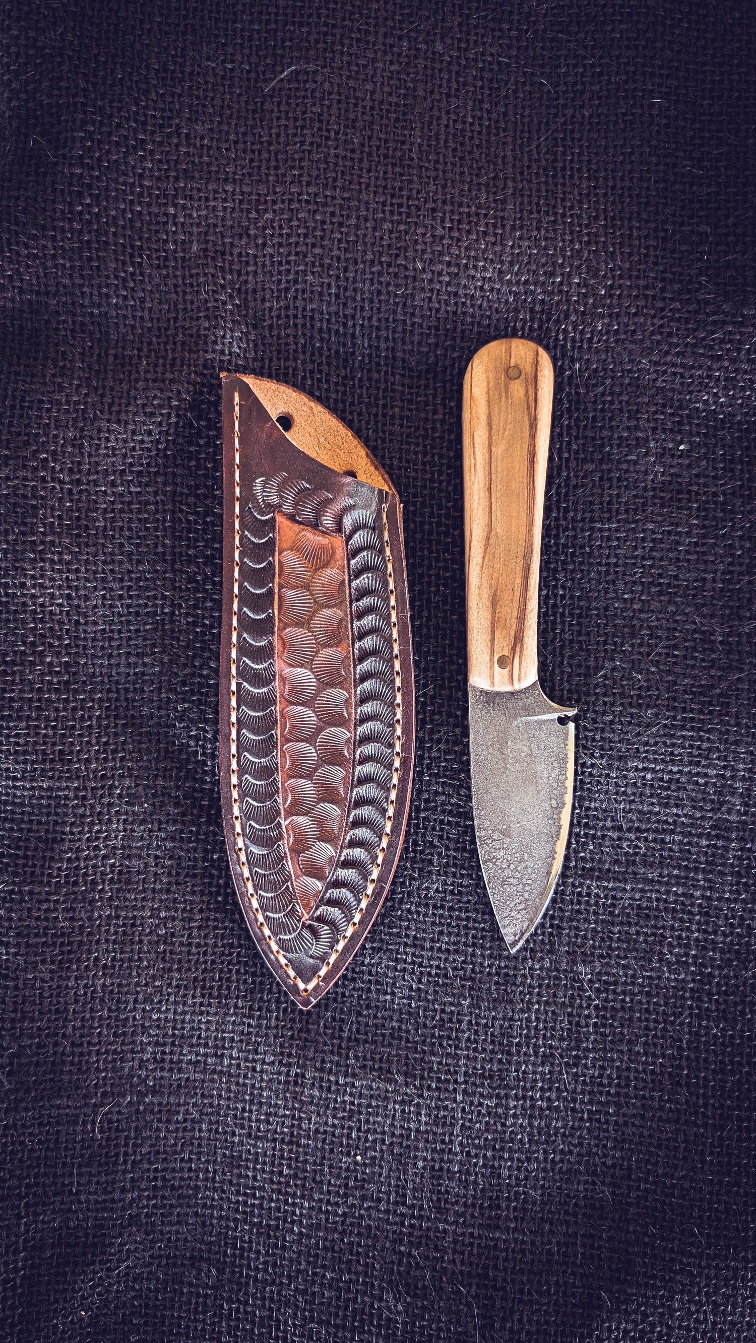 Cuchillo desbastado de acero 80CrV2, texturizado y con pátina. Cachas de olivo.