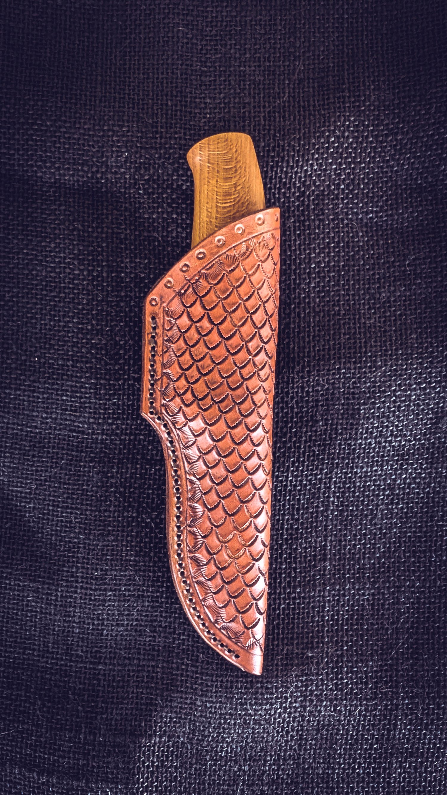 La funda es de cuero de vacuno de primera, con trabajos de repujado, cosida a mano.