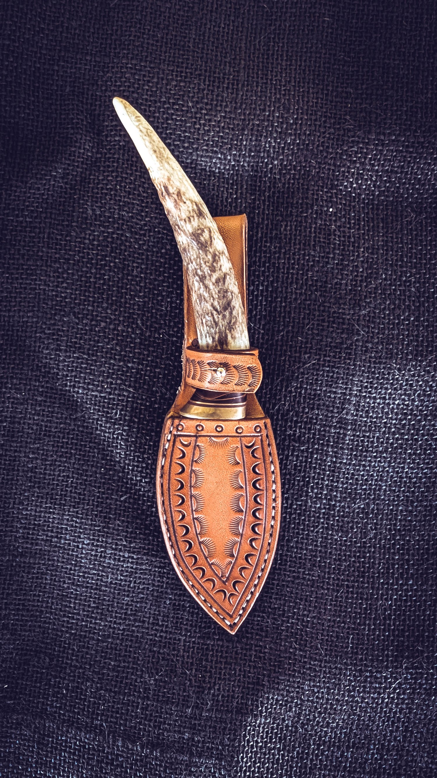 Cuchillo desbastado de acero 80CrV2 con texturizado y pátina, guarda de latón con doble encaje y soldadura de plata, el cabo está formado por latón, fibra vulcanizada, resina y punta de asta de ciervo.