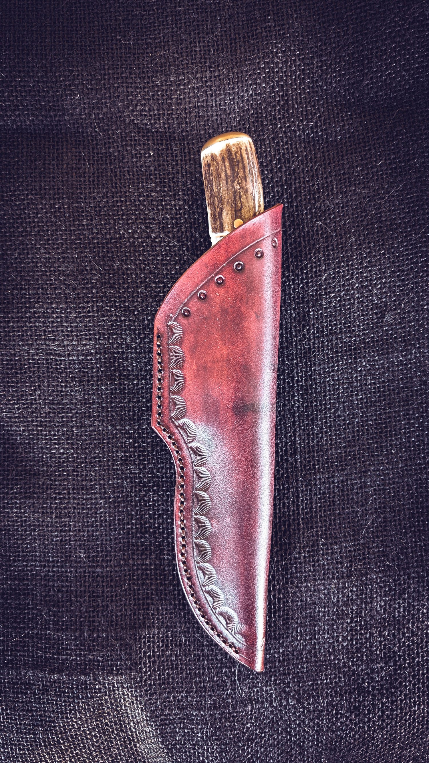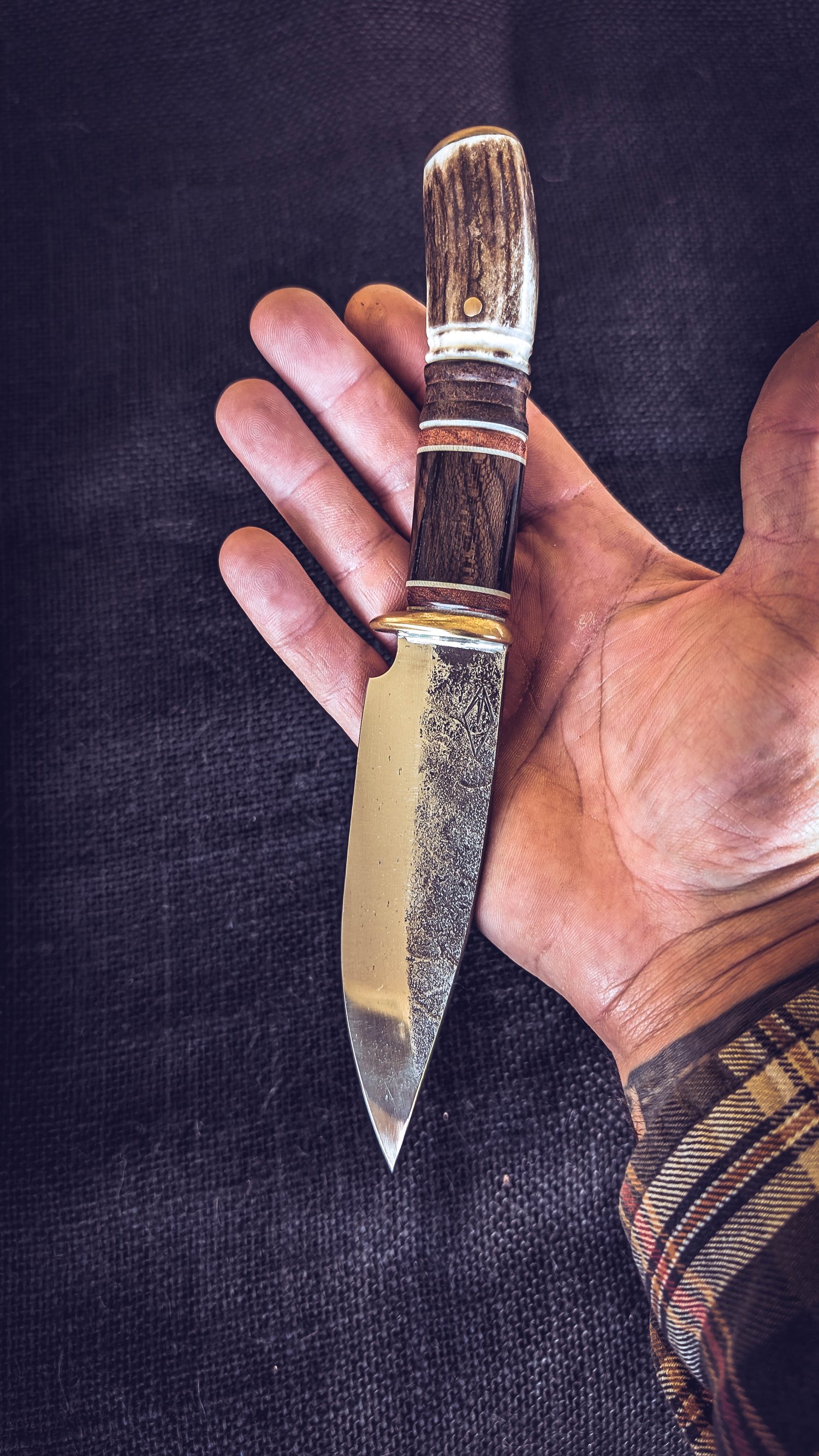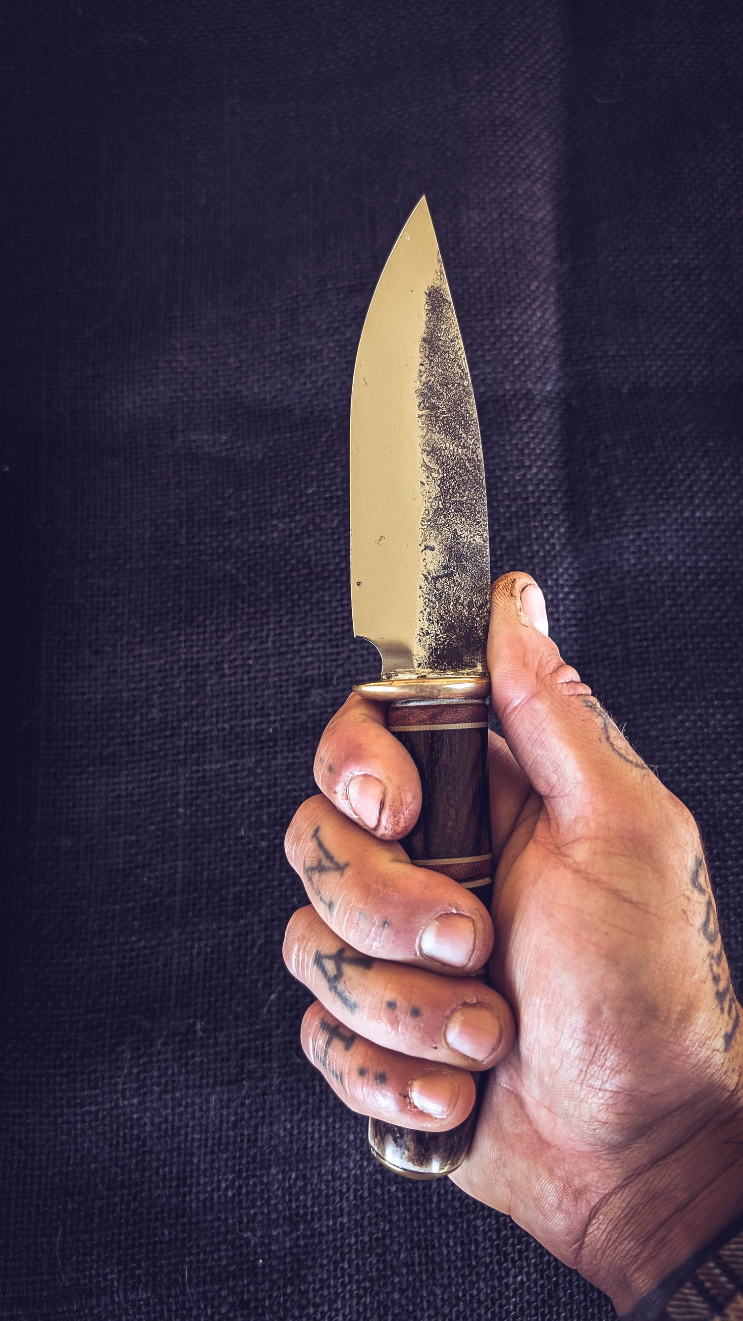 Cuchillo forjado en acero al carbono 80CrV2 con texturizado y pavonado, guarda de latón con doble encaje y soldadura de plata, el cabo está formado por latón, fibra vulcanizada, g10, palisandro, ciricote, cuero, ciervo con pomo de latón.